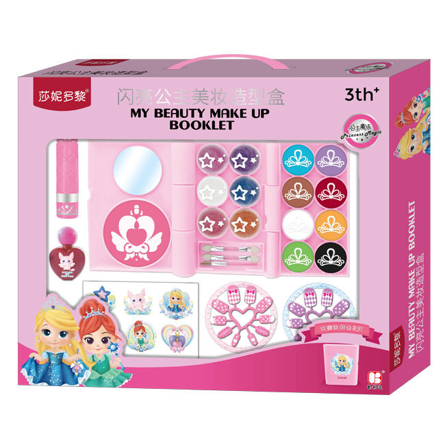 8色眼影膏,1色腮红膏,1只唇膏,6色唇彩,1只指彩,1片纹身贴纸,2只指甲圈,2片双面贴纸,3只化妆刷